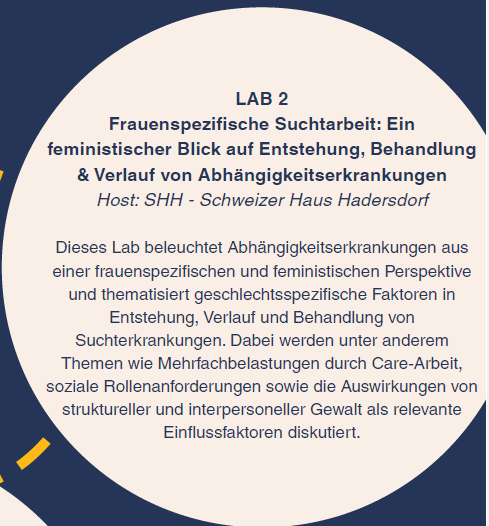 Neben einem allgemeinen Input und Austausch zum Thema Suchterkrankungen, gibt es die Möglichkeit eines von drei praxisorientierten Labs zu besuchen, die von Fachexpert_innen aus DWS-Mitglieds- bzw. Partnerorganisationen gestaltet werden.