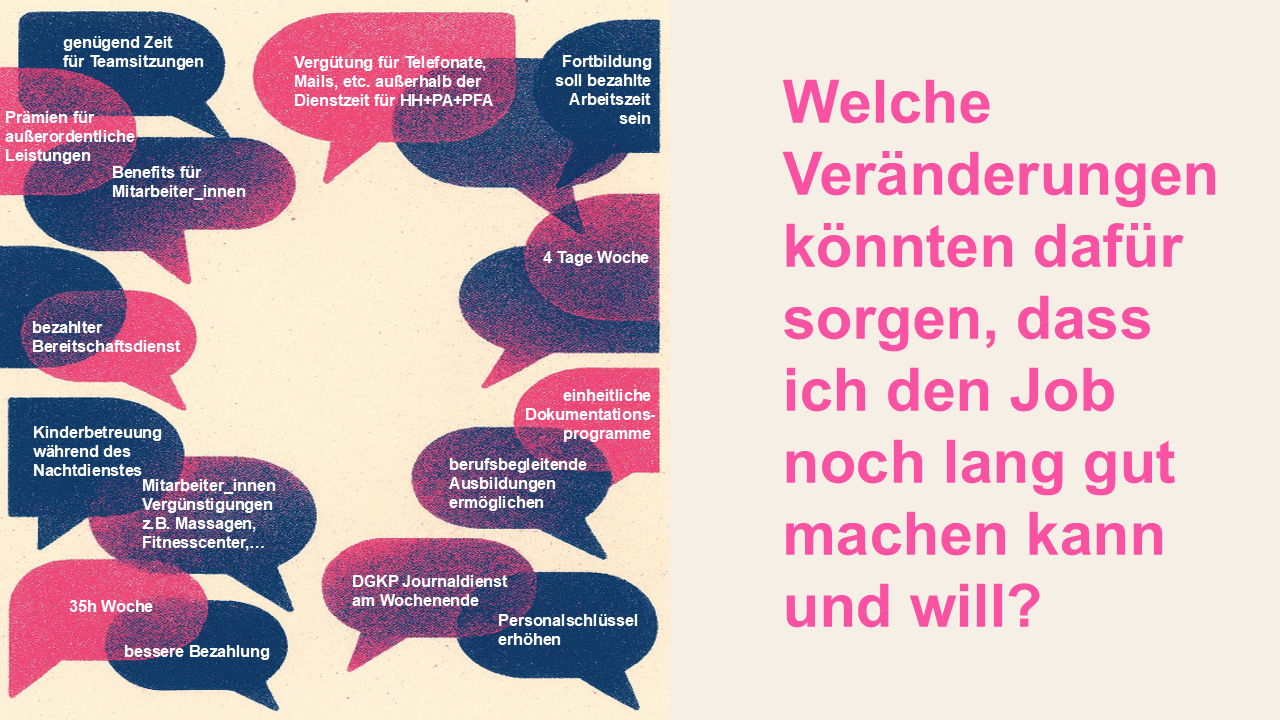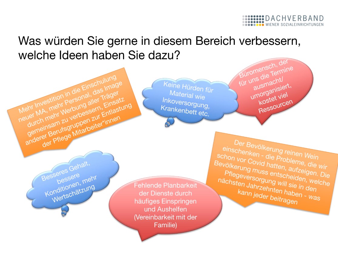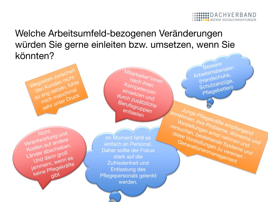 Um, ergänzend zu allgemeinen Studien, ein konkretes Bild davon zu bekommen, was die neue Mitarbeiter_innen in der Pflege hier in Wien beschäftigten, haben wir zu einer Online-Umfrage eingeladen. Wir freuen uns sehr, dass mehrere hundert Kolleg_innen dieser Einladung gefolgt sind, und sich für eine Verbesserung der Arbeitsbedingungen eingebracht haben. Um einige der aufgebrachten Ideen detaillierter Besprechen zu können, haben 20 Teilnehmer_innen zu einem Open Space Workshop zu uns in den Dachverband Wiener Sozialeinrichtungen eingeladen. In einem professionellen und engagierten Austausch konnten wir das Bild aus der Umfrage damit abrunden.